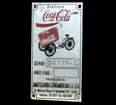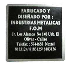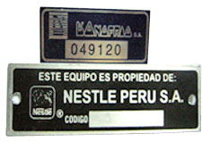 Placa: Diseñado en plancha Inoxi Logomarca: Serigrafía del Producto. Código: Indica una serie acunada en alto relieve indicando año y número